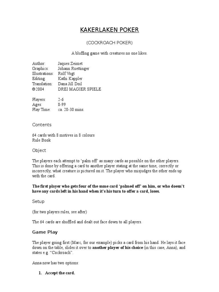 Up to 24 cash back PDF Cockroach poker rules pdf books 2017 list. LimeyGeeza Cockroach_Poker_8x11pdf 657 MB Re-Theme of Cockroach Poker - just print 8 sets back to. Changing the rules Simplifying or eliminating complicated or unnecessary rules.